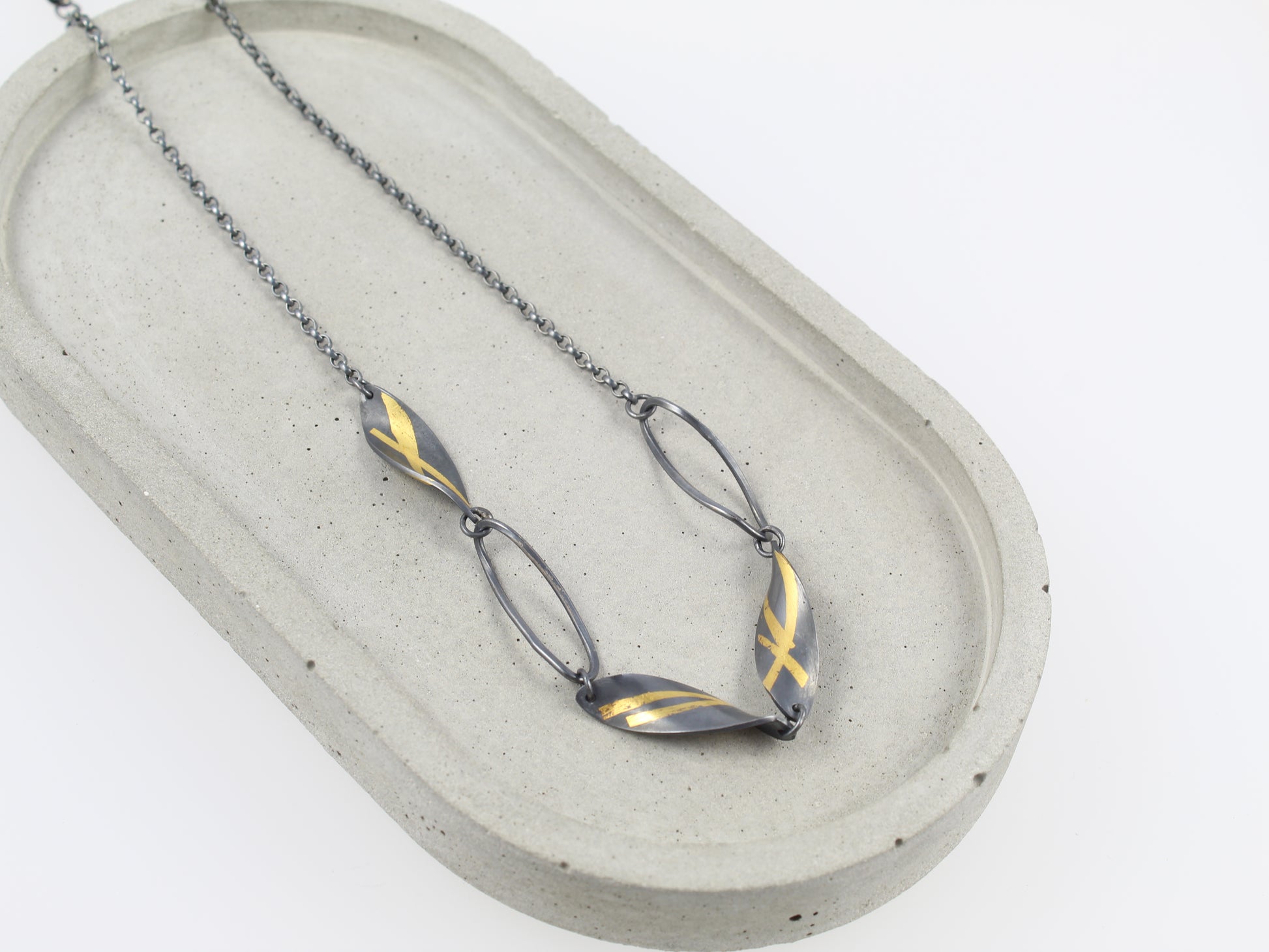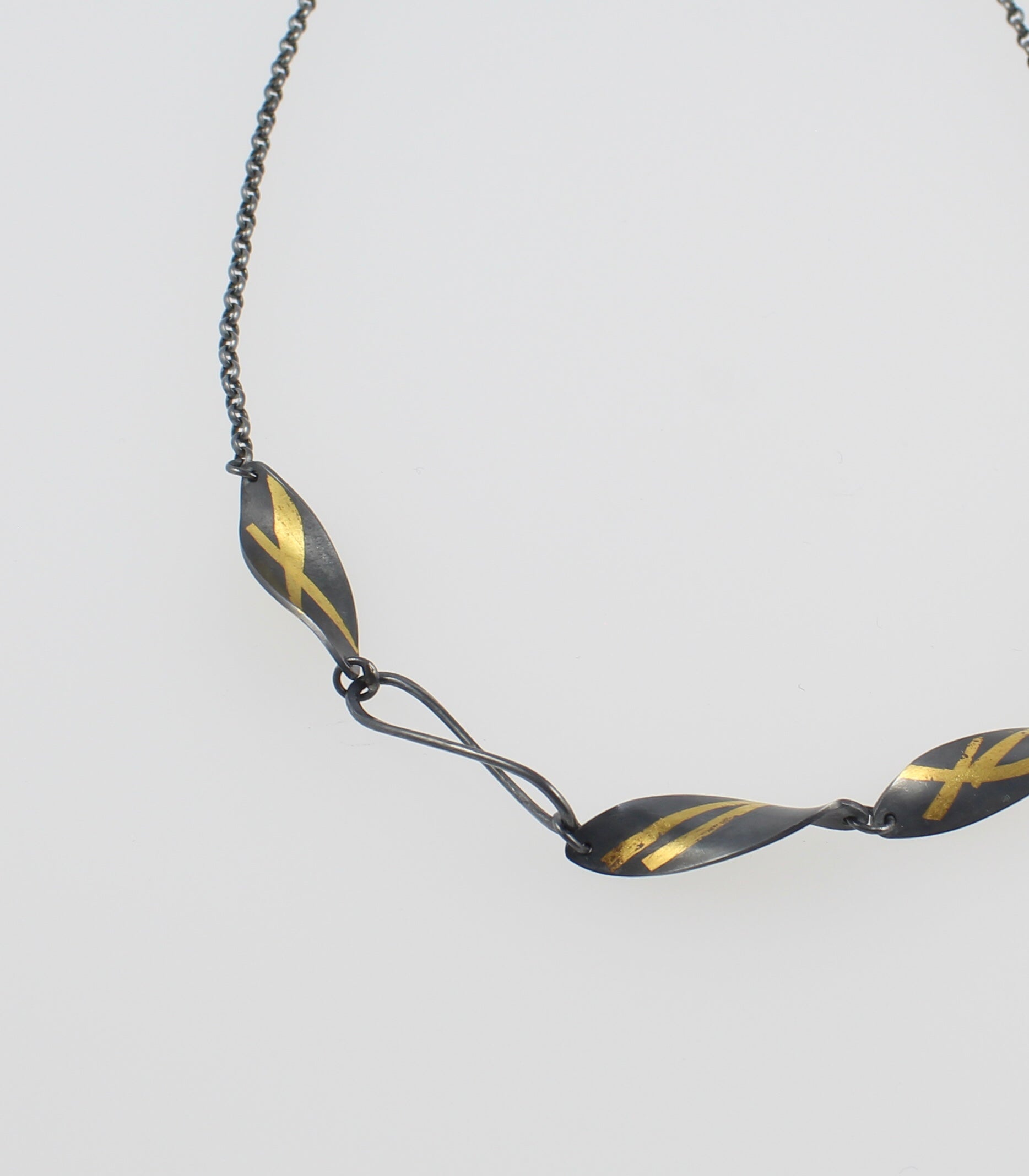 This necklace is a celebration of contemporary design. Each link is individually handcrafted in sterling silver, shaped into a sequence of twisted and stylised leaf forms. Accents of rich 24ct gold are applied using the ancient Korean technique of Keum Boo, where gold is permanently fused to silver using heat and pressure. The gold has been added to both sides of the leaves showing the detail as the necklace moves and then the silver has been oxidised resulting in a contemporary look that really makes the gold pop!