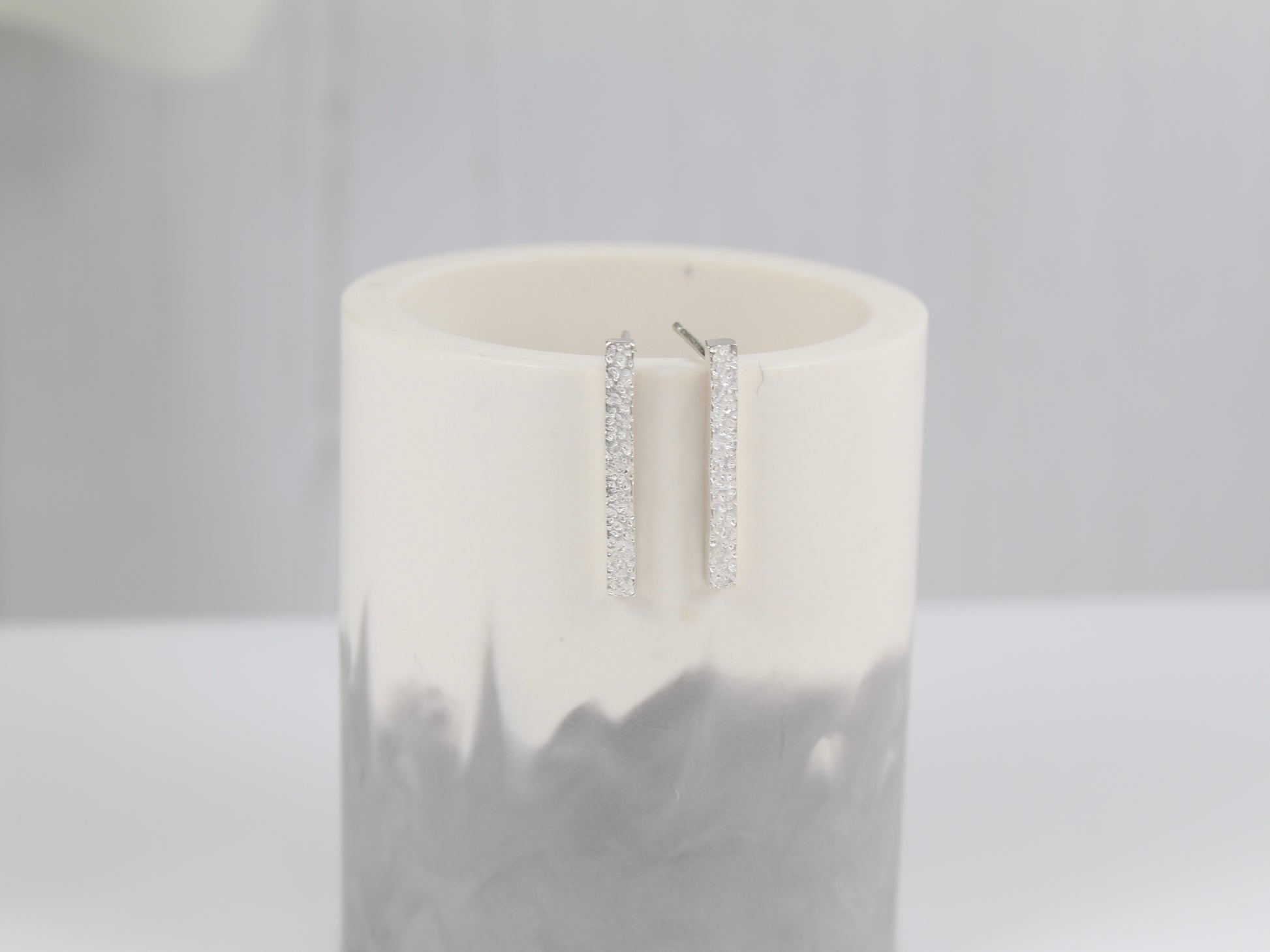 Elevate your everyday style with these handmade striking Silver Bar Stud Earrings, featuring a bold, heavily sand-textured finish that catches the light with organic brilliance. Handcrafted in solid sterling silver, each bar is uniquely marked with a raw, tactile surface reminiscent of weathered stone.