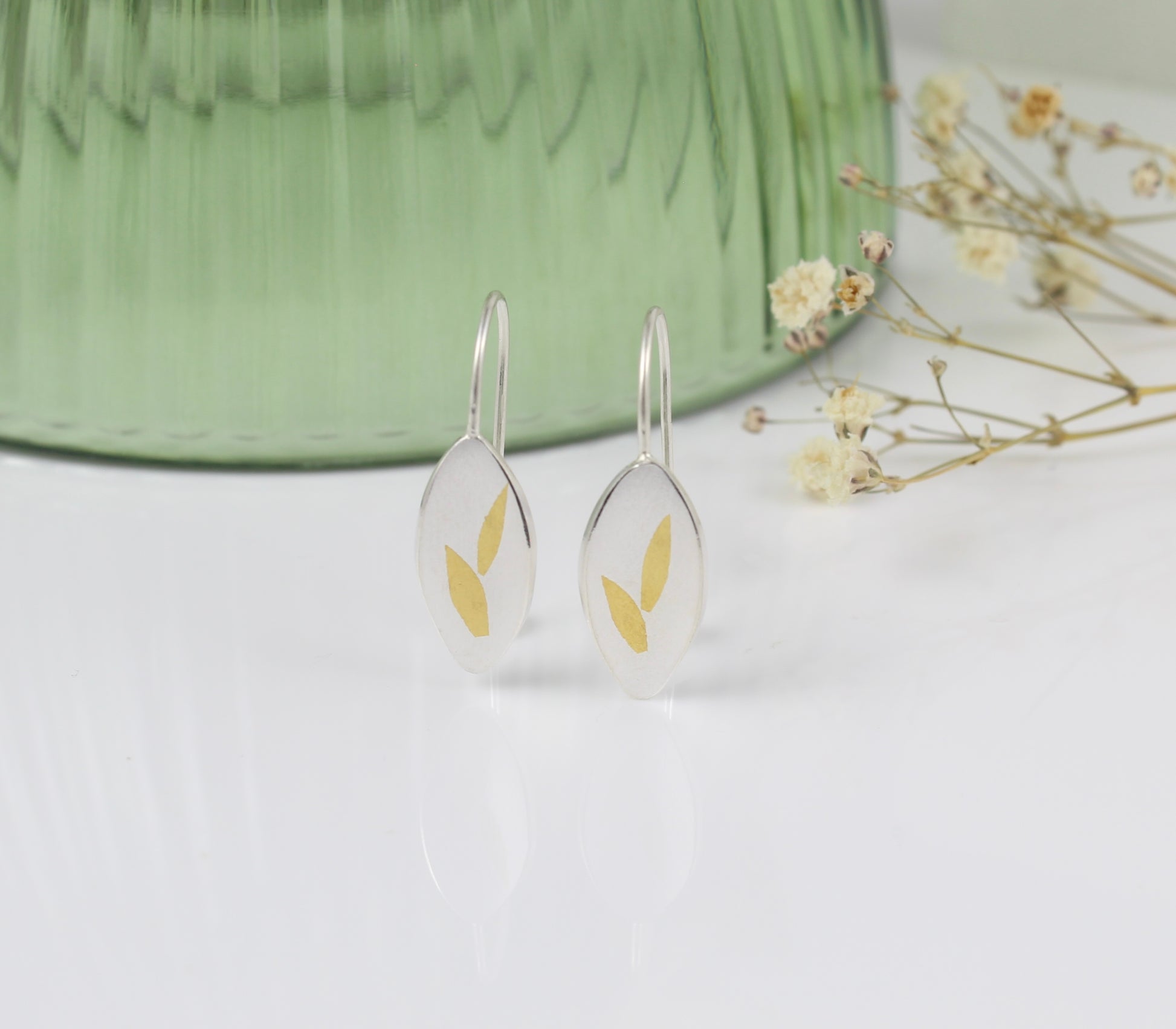 These contemporary leaf-shaped ear threaders are individually handcrafted, featuring a graceful leaf silhouette that catches the light with every movement. The delicate gold detailing is applied using the ancient Keum Boo technique creating a luxurious contrast between the satin silver base and the rich golden accents.