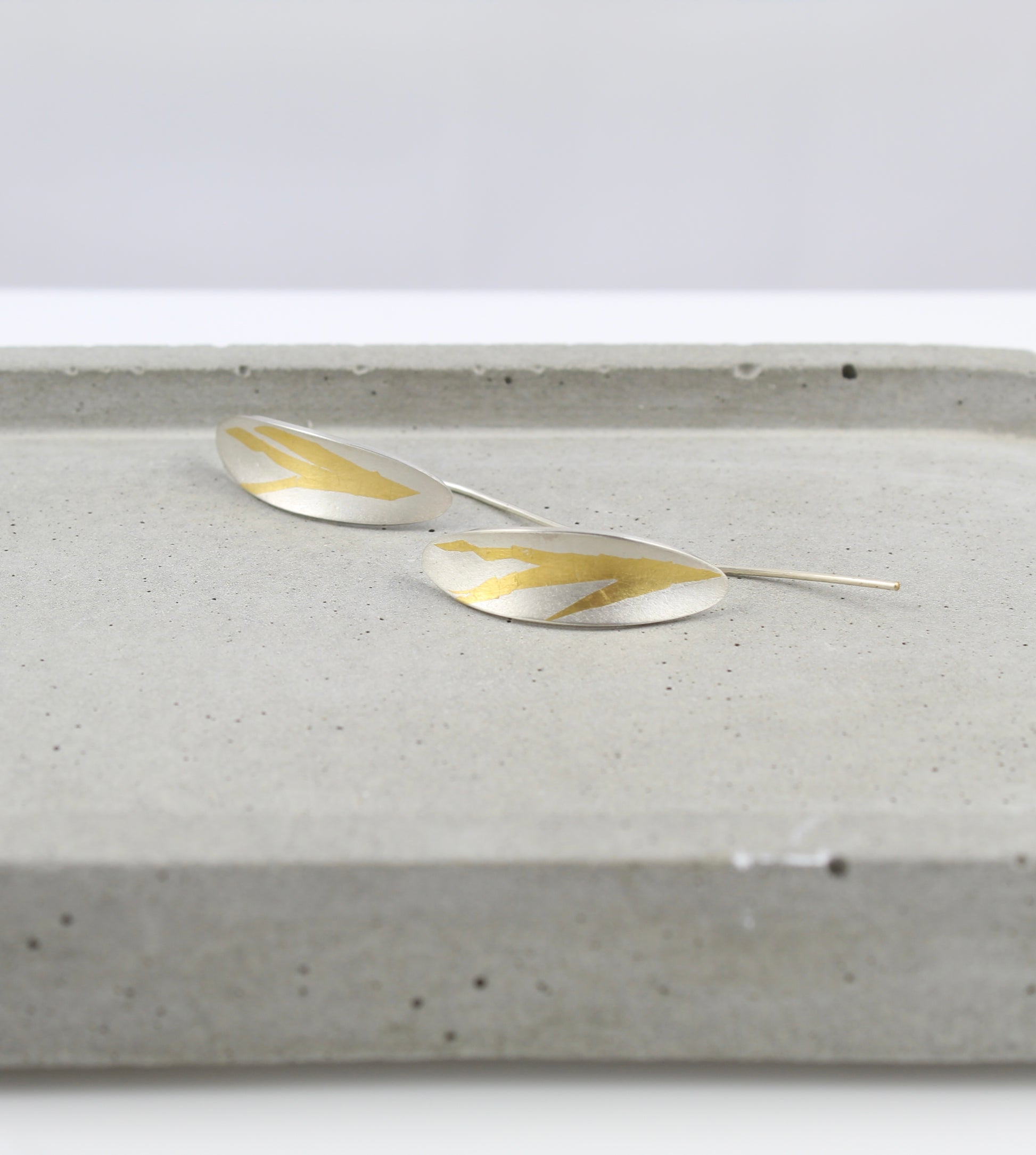 These elegant ear threaders are crafted in fine silver and shaped into graceful, leaf-inspired forms. Finished with a soft satin texture, each earring catches the light gently, highlighting the subtle curves of the design. A touch of rich 24ct gold is fused onto the surface using the ancient Korean technique of Keum Boo, adding warmth, contrast, and a hint of luxury to the cool silver.