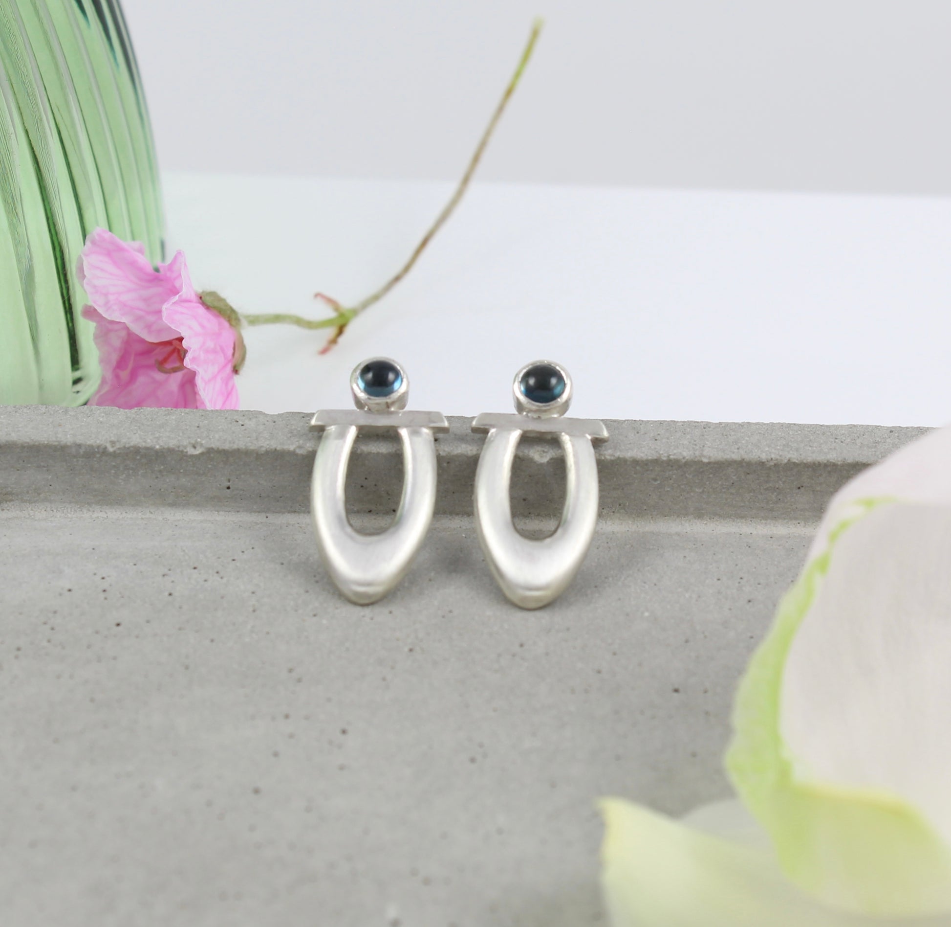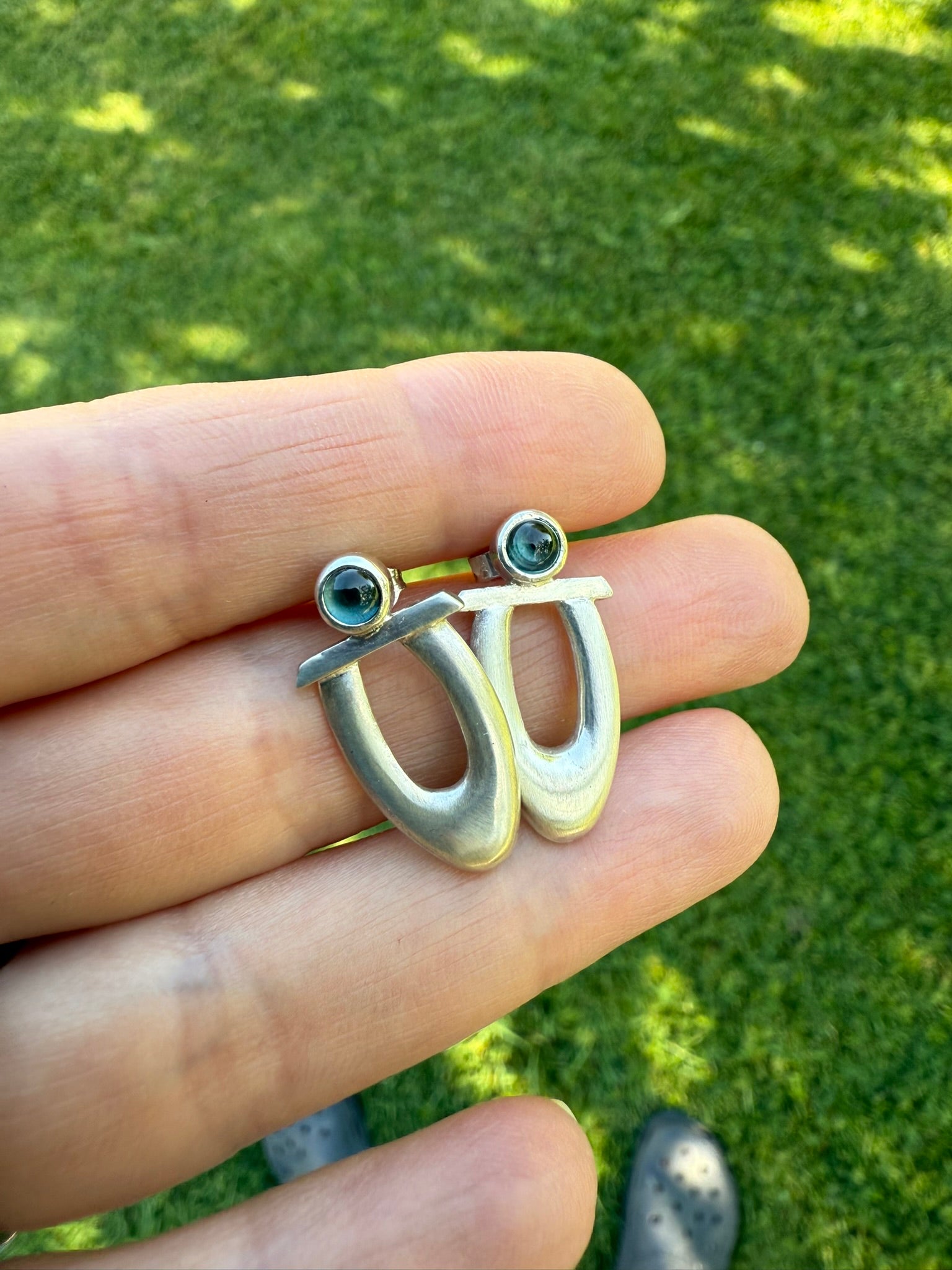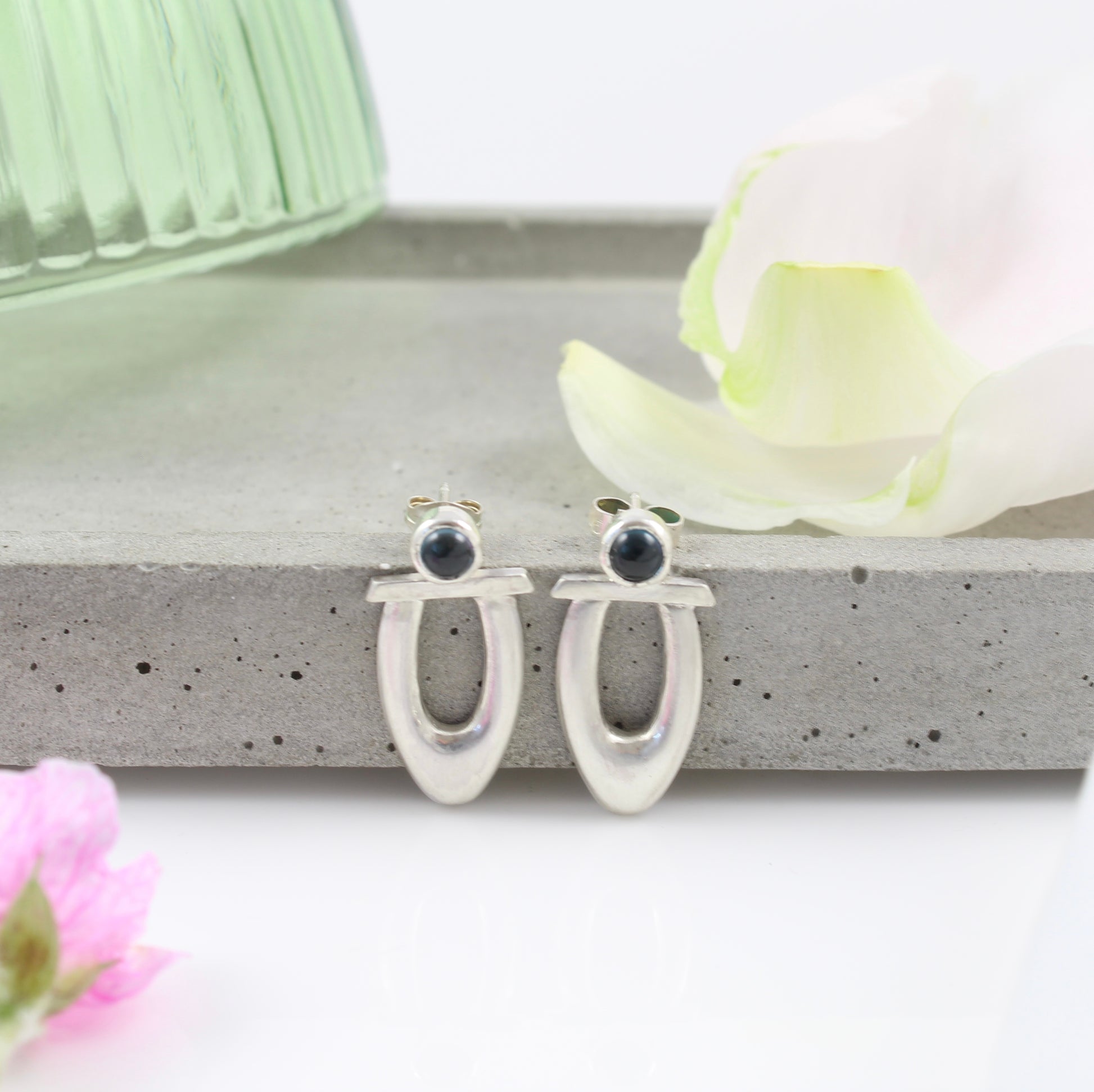 Inspired by a drawing of a peacock feather these sterling silver studs have been made by hand. The 'feather' shape made using a die and punch made to my design and then pierced out of the silver and fabricated using traditional techniques.