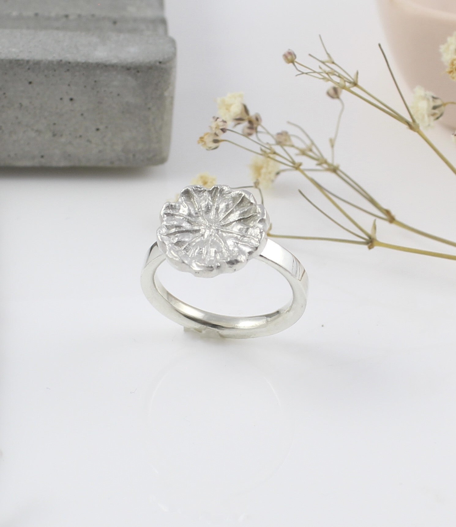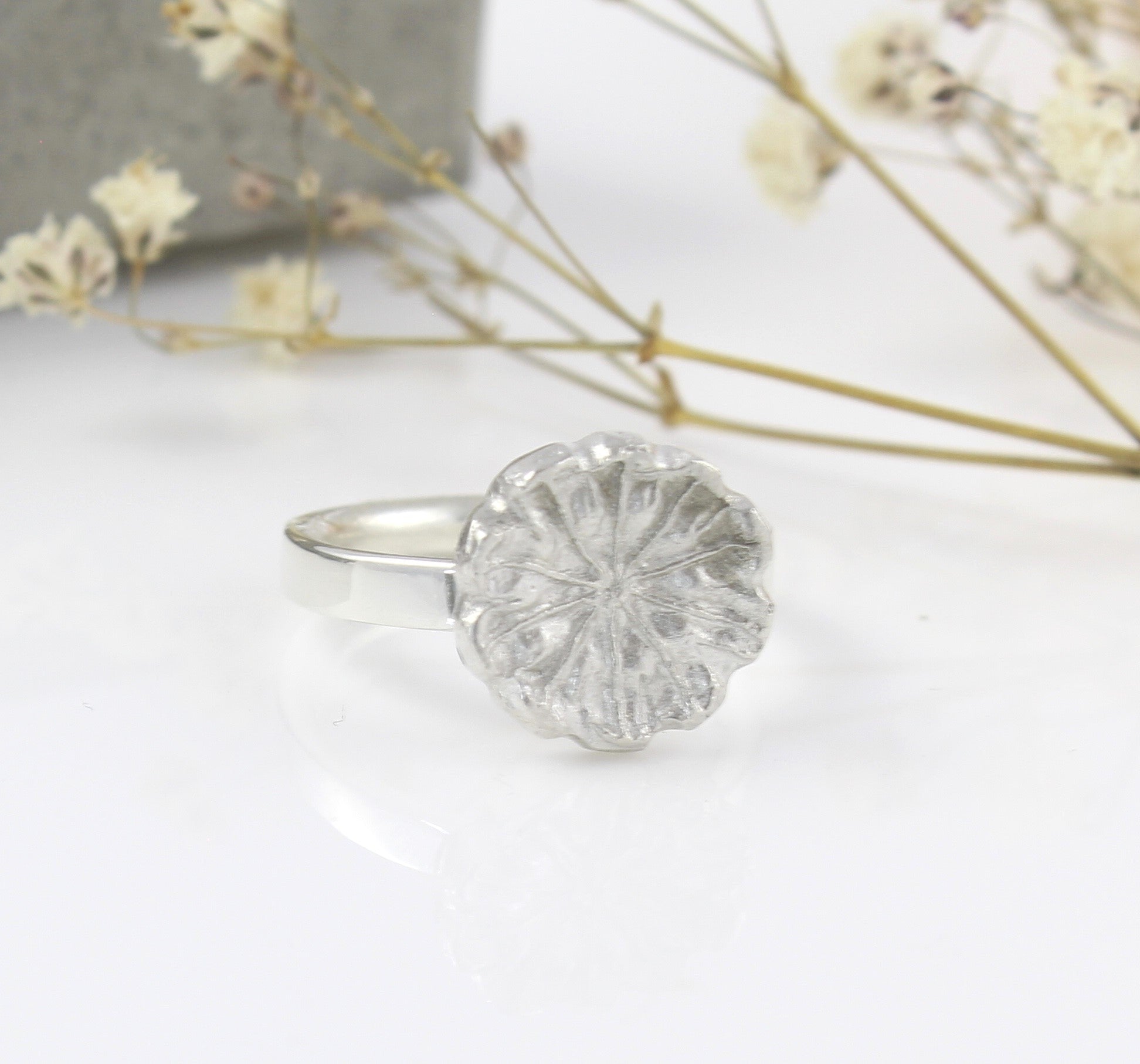 The design intricately captures the organic shape and fine details of the natural form, transforming it into a wearable piece of jewellery. The ring surface bears the textured appearance of the poppy’s seed head, with each groove, ridge, and tiny indentation cast to echo the subtle nuances of the plant.