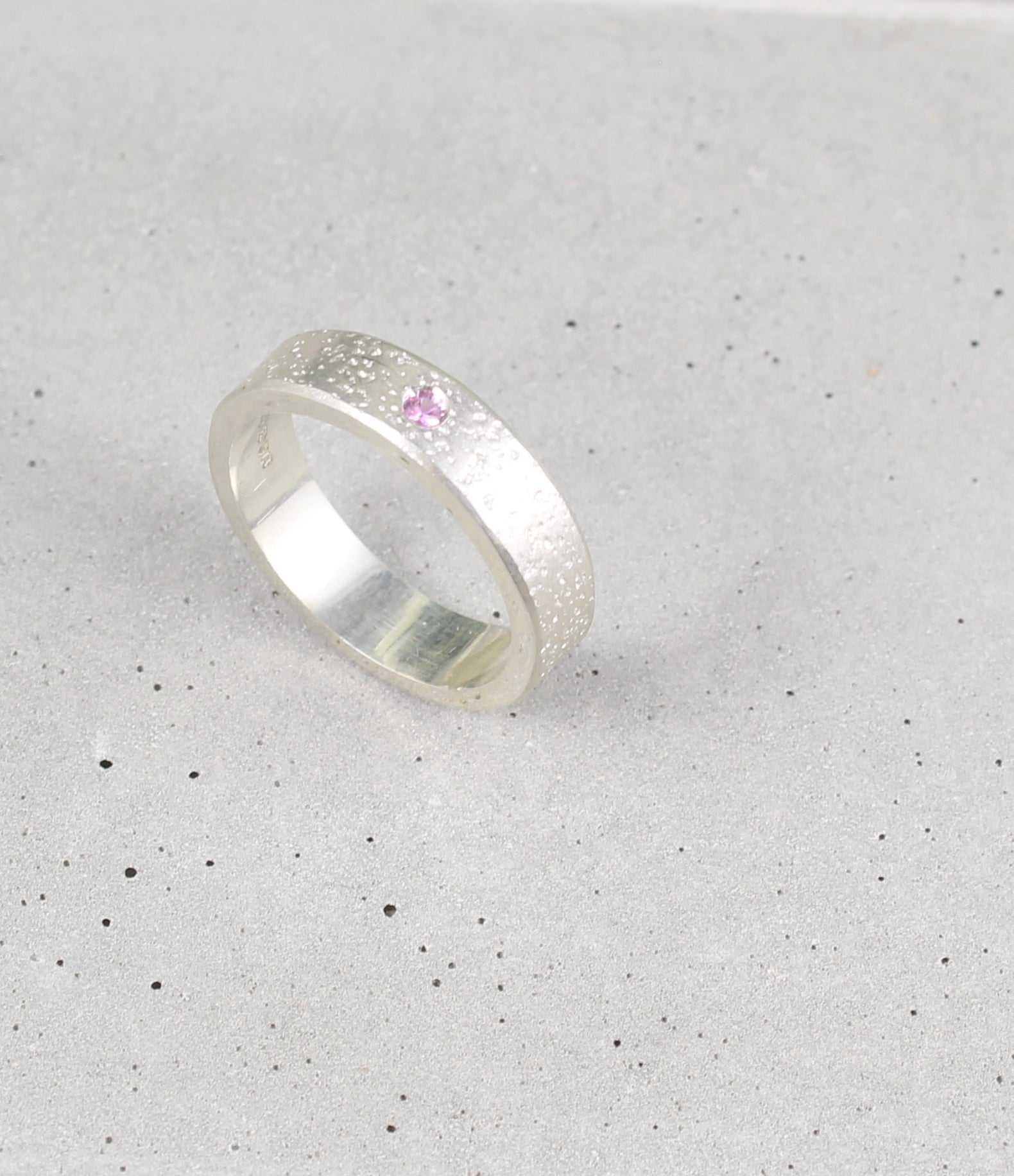 This sand-textured silver ring features a soft satin finish and a burnished edge that adds a subtle polished contrast. Crafted in sterling silver with a flush set pink Sapphire, it offers a refined, contemporary look with a tactile feel.