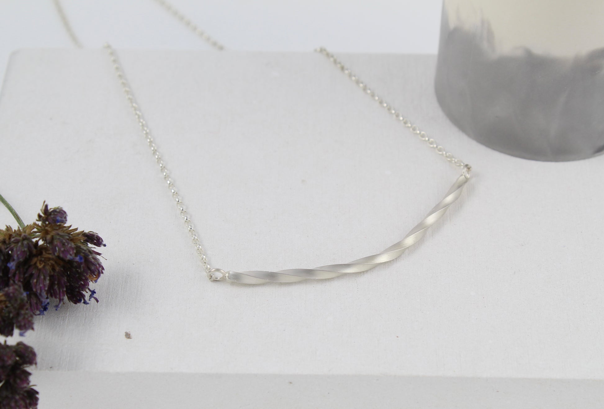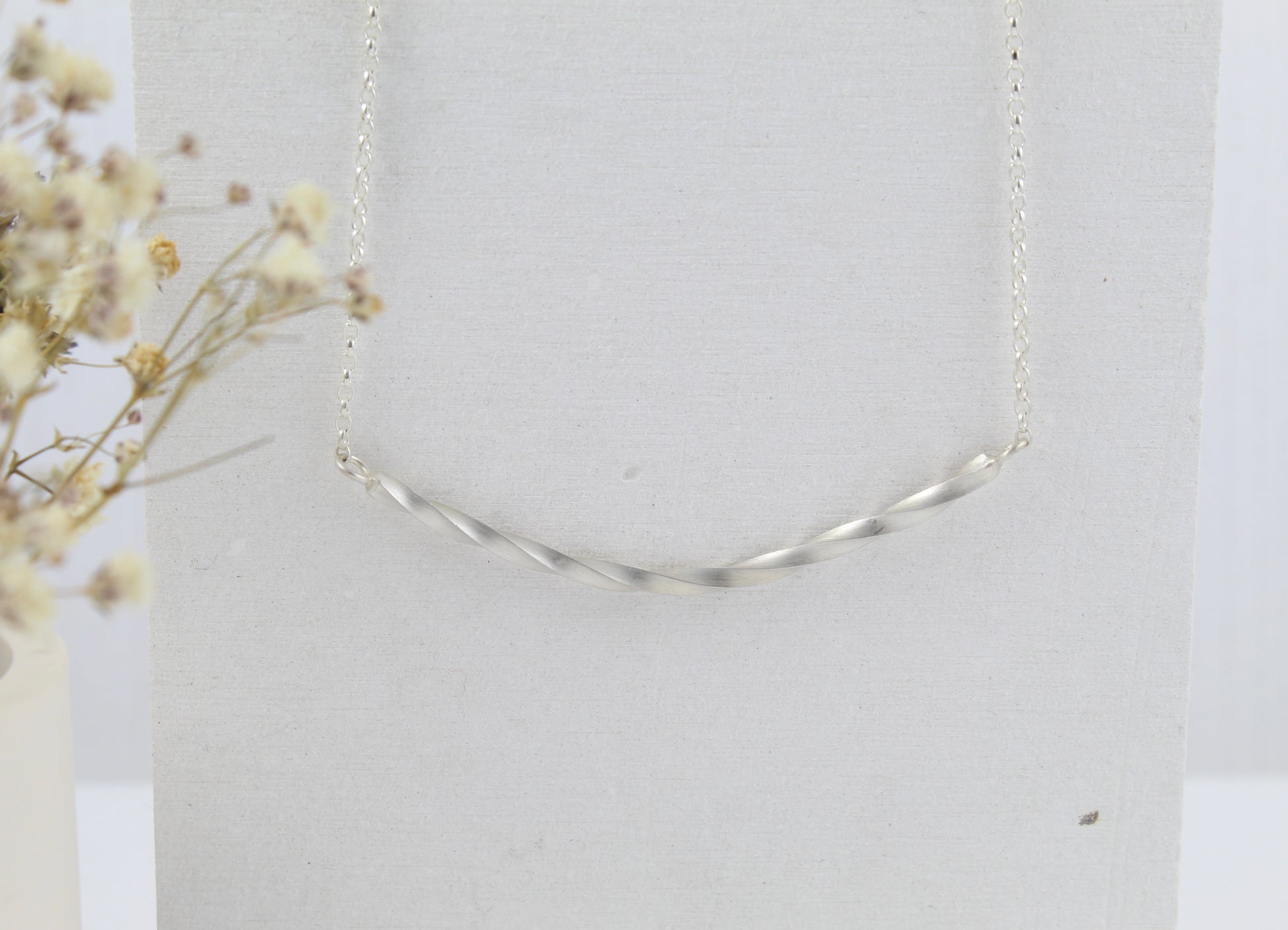 A special sterling silver twisted bar necklace, simple and elegant. The soft satin finish gives the silver a beautiful glow.