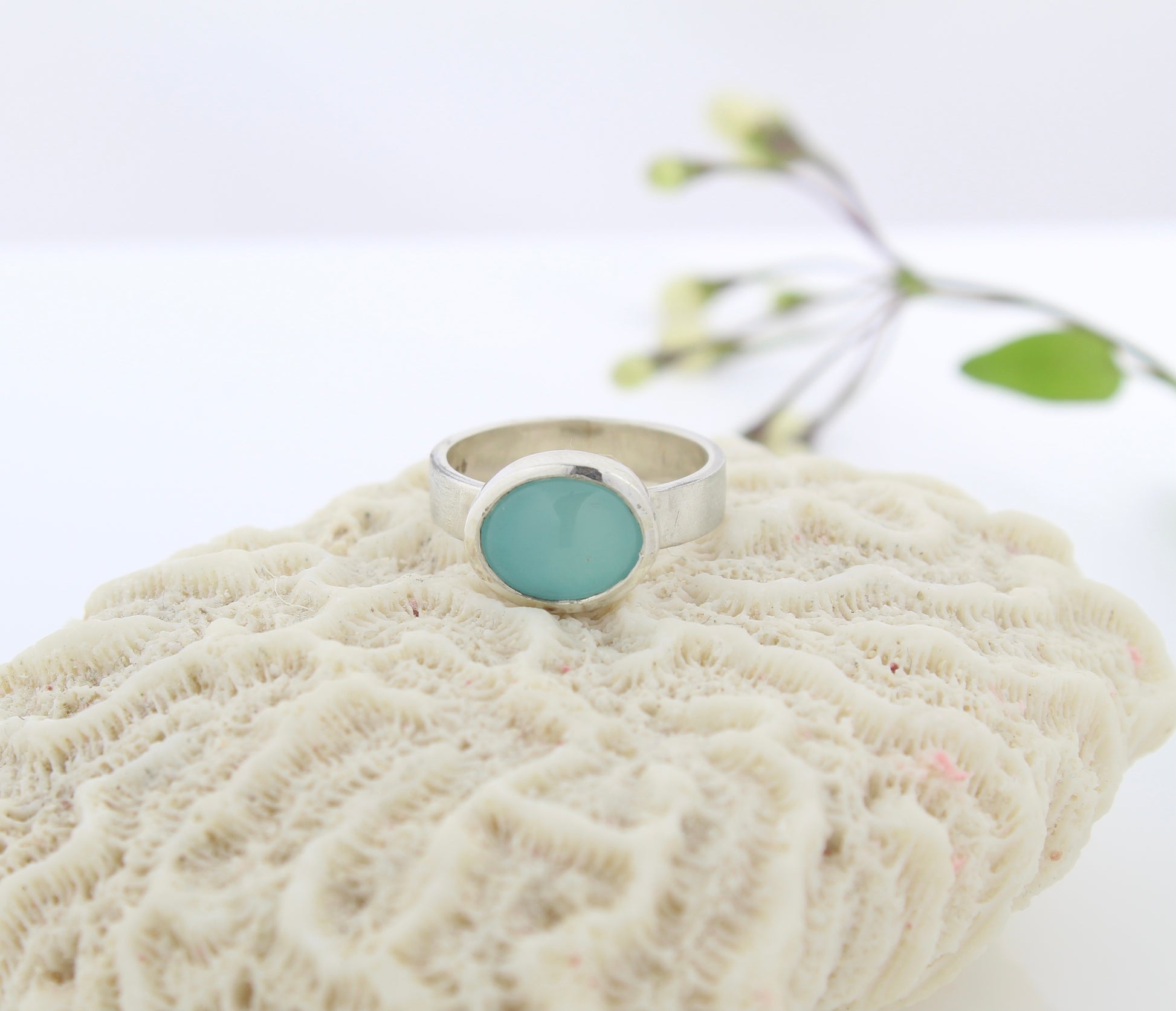 This simple, contemporary ring shows off the lovely colour of this sea blue agate. It is handmade in sterling silver and fully hallmarked.