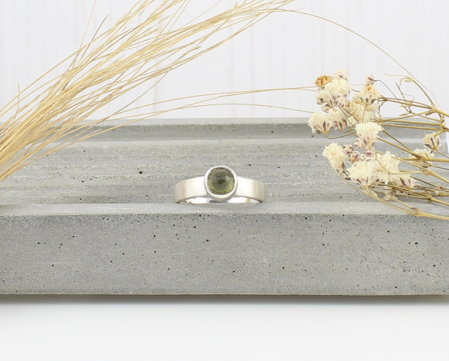 A beautiful pastel rose cut green tourmaline makes a statement on this simple contemporary ring and the 4mm wide band has a lovely soft satin finish.